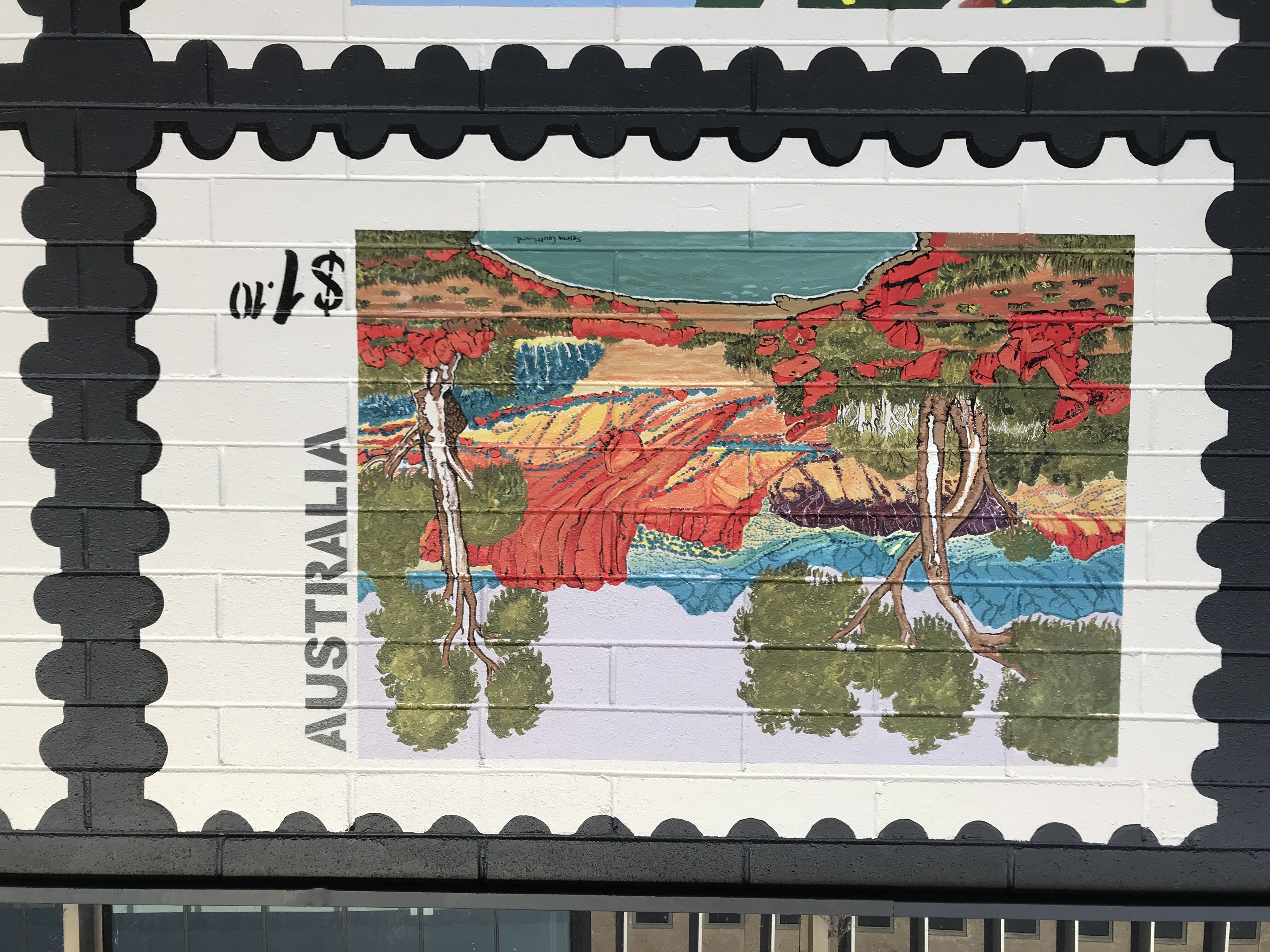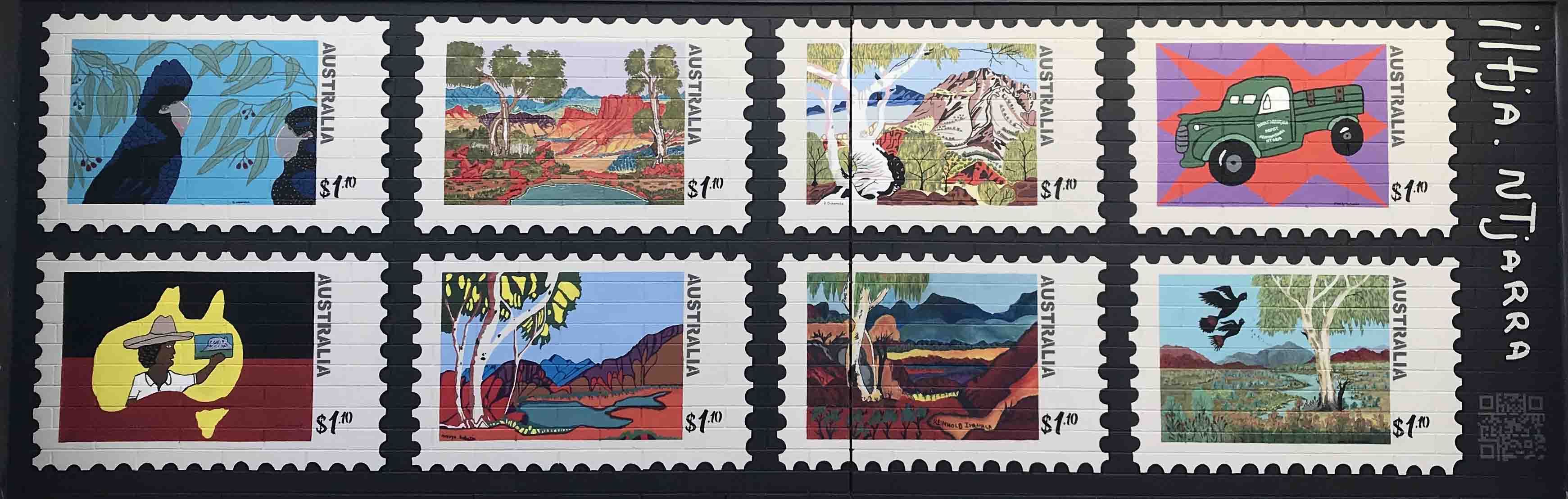 The location of the mural, on the Alice Springs Post Office’s wall, holds particular significance in that it reimagines the 2002 Birth Centenary of the Albert Namatjira Mini Sheet stamp set – a fitting tribute to this true Australian icon, with the artists drawing inspiration from a previous collaboration with artist, Tony Albert.