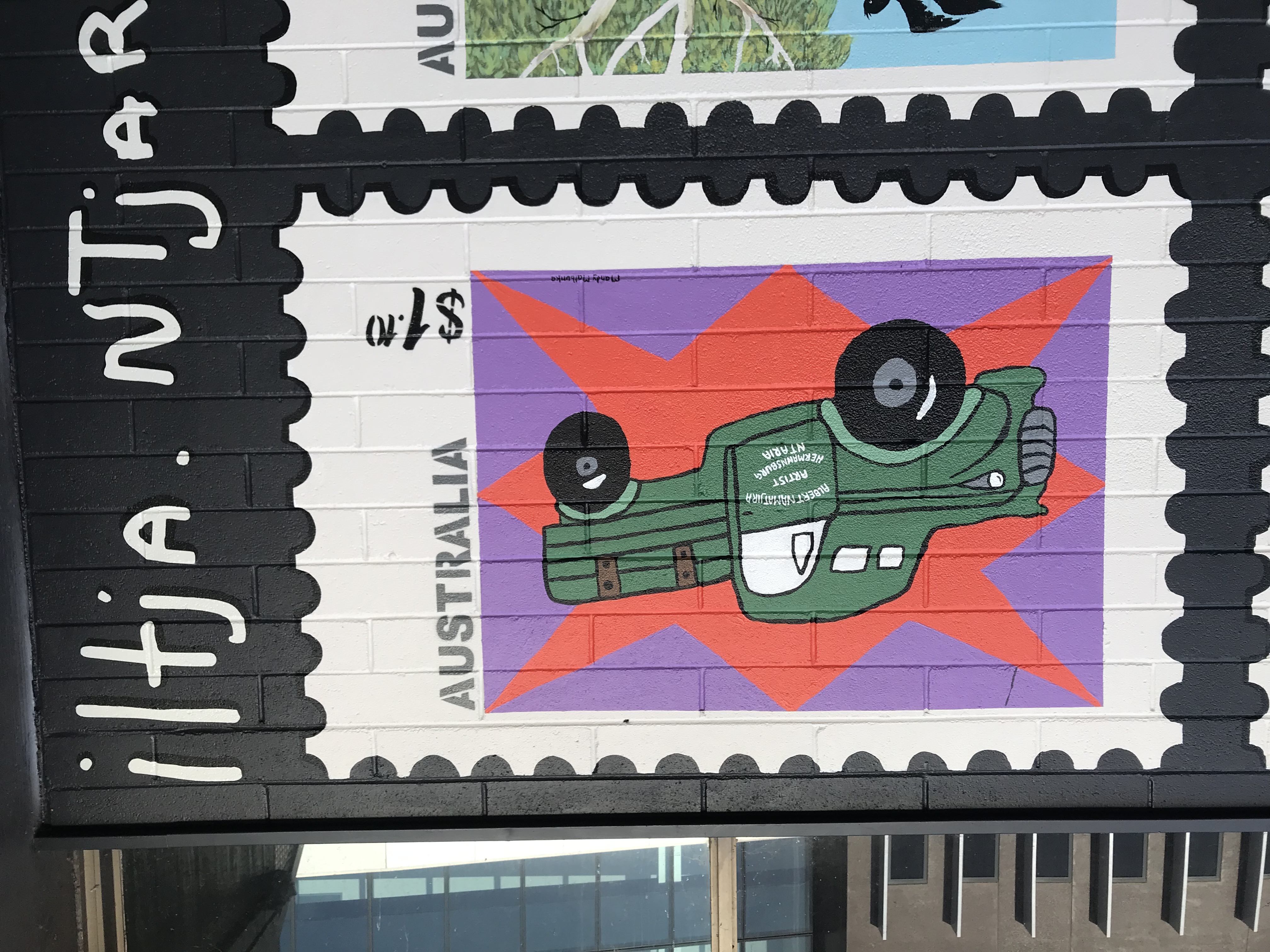 Under the guidance of senior artists, Mervyn Rubuntja and Selma Coulthard, artists of Iltja Njtarra Art Centre developed and painted a collaborative mural in the Mparntwe CBD entitled Don’t Stamp on Country.
